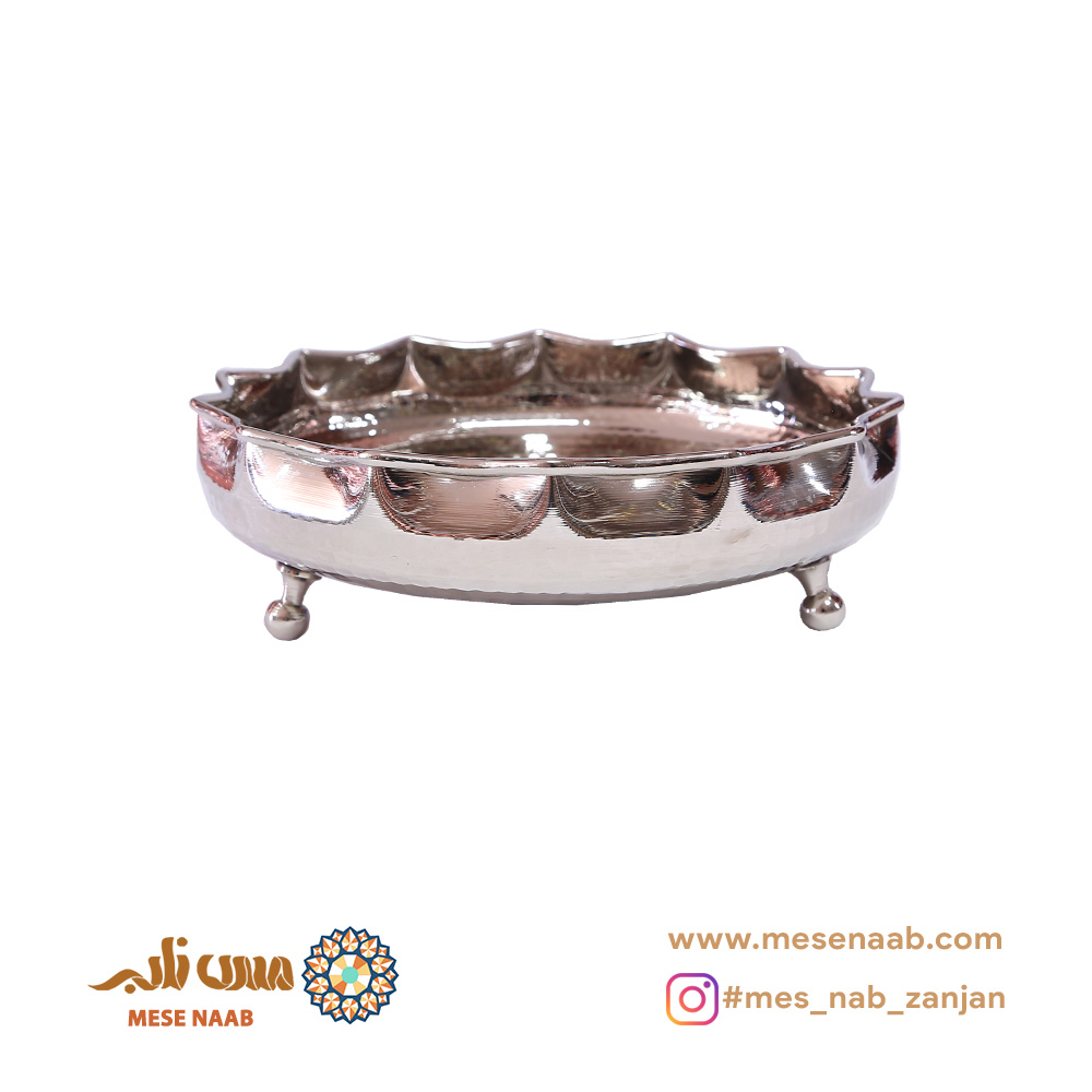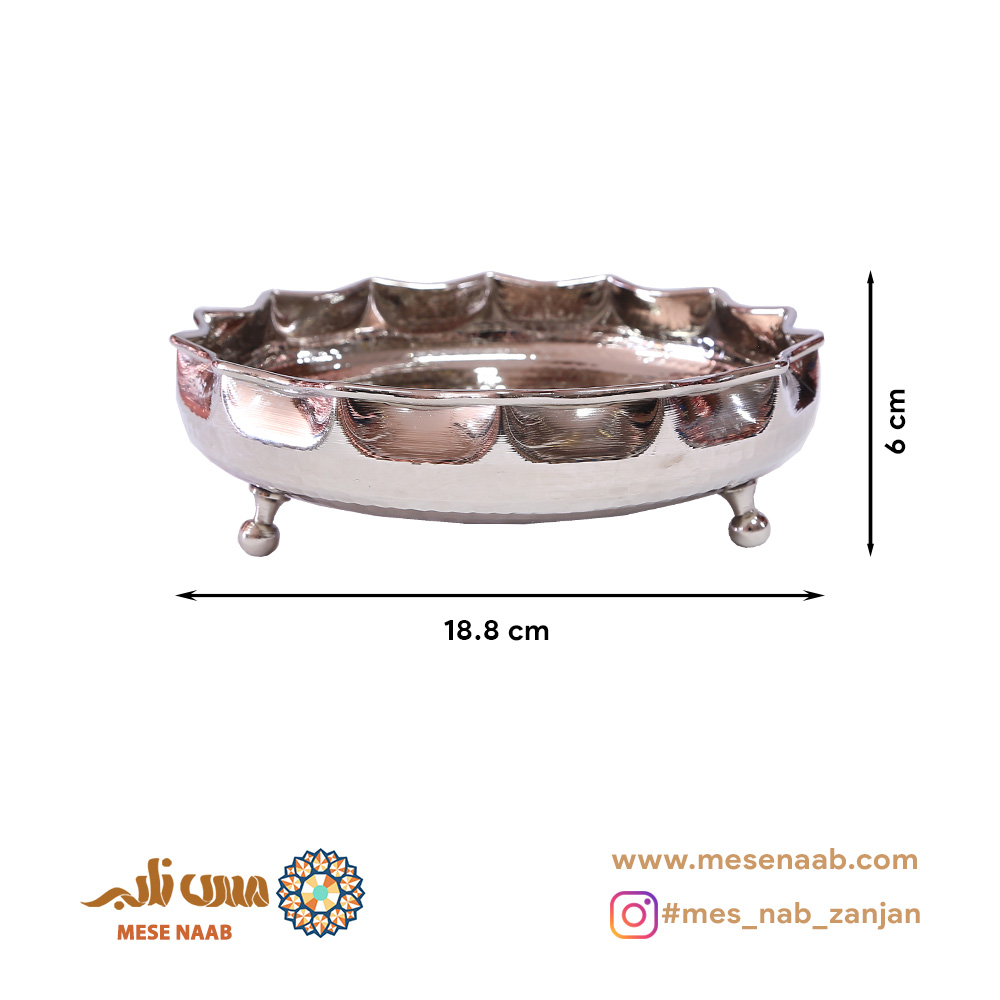 شکلات خوری سه پایه آفتابگردان کروم، محصولی شیک و بادوام با طراحی چکشی و کنگره‌های پهن، پایه‌های برنجی و آبکاری کروم درخشان. تولید شده در زنجان و عرضه شده در مس ناب؛ مناسب برای پذیرایی شکلات و مواد غذایی خشک. تمیز کردن آسان با حوله نرم توصیه می‌شود.