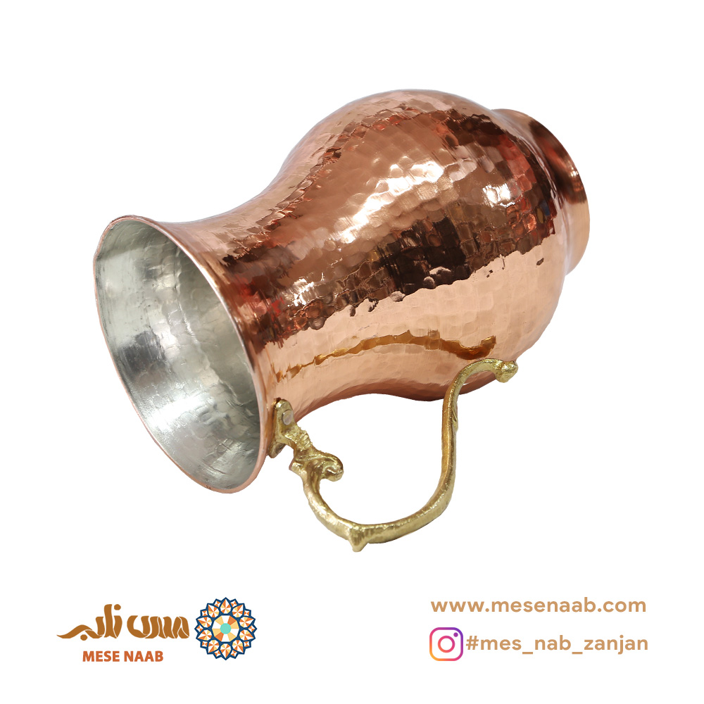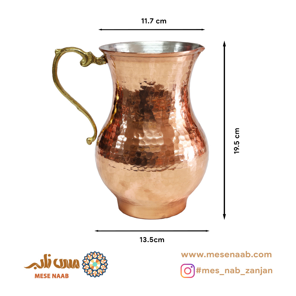 سطح پارچ بهصورت چکشی طراحی شده و رنگ مسی طبیعی آن با یک لایه نانو یا پلیاستر پوشانده شده تا از اکسید شدن جلوگیری کند و درخشندگی آن حفظ شود. دستهای از جنس برنج با وزن مناسب، هم زیبایی و هم راحتی در استفاده را فراهم کرده است.